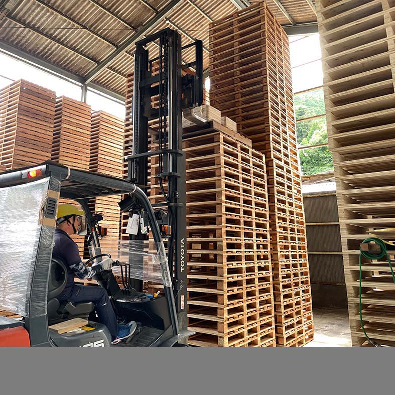 組み上がったパレットは倉庫の中に積んでおくだけでは乾燥しない為、天気をみながら屋外で天日干ししたり倉庫に入れたりを繰り返して乾燥させます。